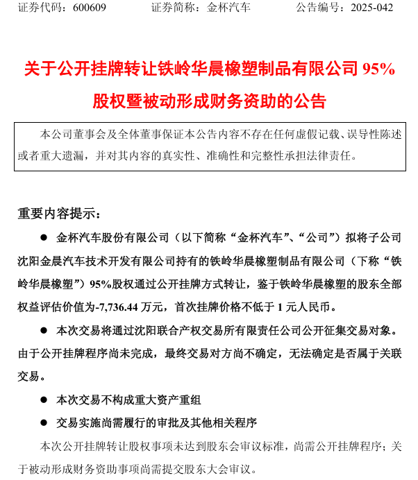 截至2025年8月31日,金杯汽车应收铁岭华晨橡塑款项达4223.37万元,其中4132.37万元为支持其发展形成的其他应收款,股权转让后将被动形成财务资助。
