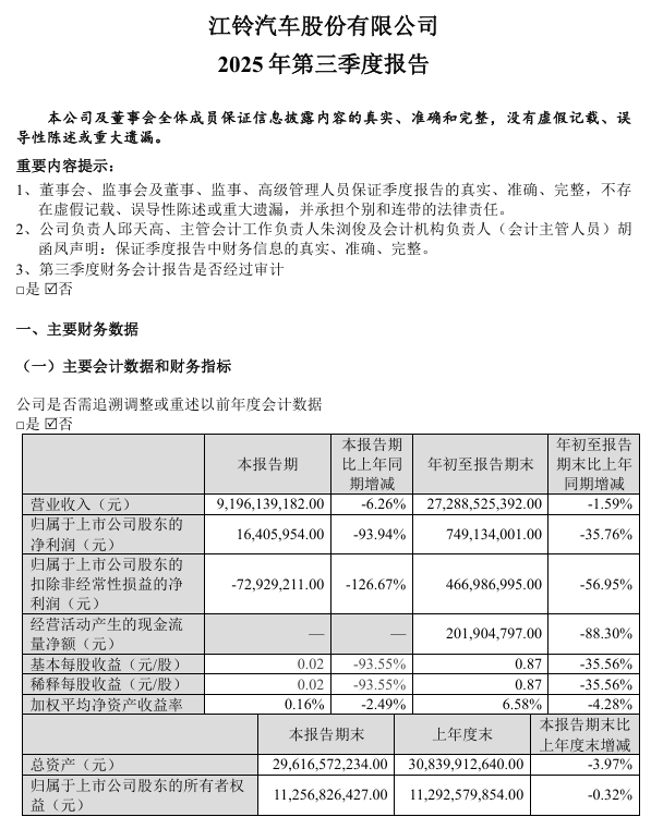 近日,江铃汽车发布2025年第三季度报告,报告显示,该公司第三季度实现营业收入91.96亿元,同比下降6.26%;实现归母净利润1640.60万元,同比大幅下滑93.94%;实现扣非后归母净亏损7293万元,同比下降126.67%;基本每股收益为0.02元/股。