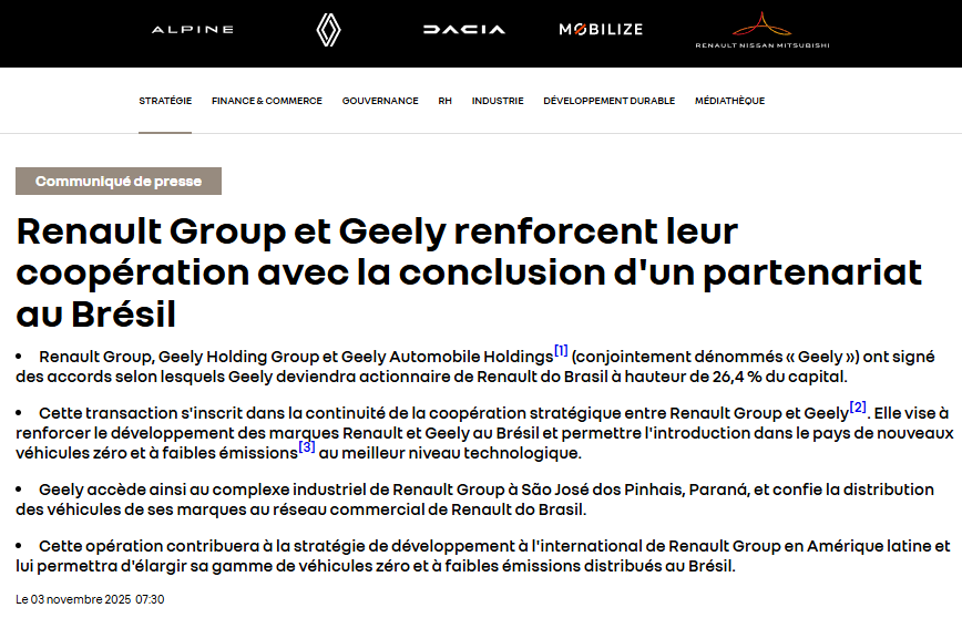 近日,据雷诺集团11月3日发布的公告,雷诺集团与吉利控股集团双方正式签署巴西战略合作最终协议,吉利将收购雷诺巴西公司26.4%股权,雷诺集团仍保持控股股东地位并将其纳入合并财务报表。