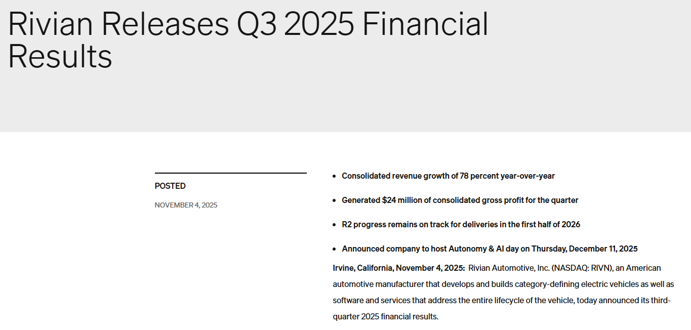 财报显示,三季度Rivian交付量同比增长32%至13201辆,营收同比大涨78%至16亿美元,增长动力主要来自美国联邦电动车税收抵免政策到期前的集中购车潮。