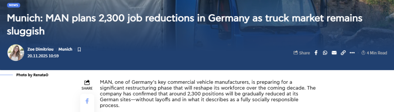 曼恩商用车发言人解释,裁员是应对市场困局的必要举措。一方面德国卡车市场需求持续疲软,另一方面高昂的能源与劳动力成本,叠加亚洲制造商的竞争冲击,已严重挤压企业盈利空间。