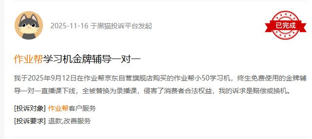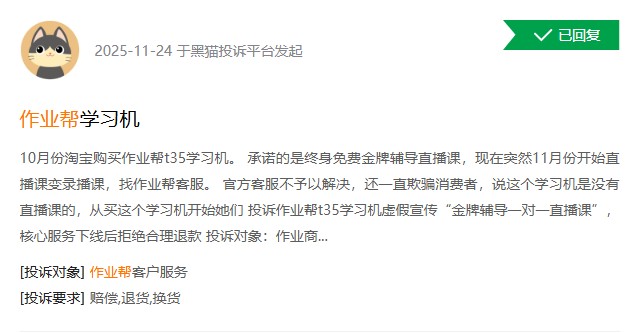 在黑猫投诉平台上也有多位消费者反映称,所谓的“终身免费金牌辅导直播课,被替换为录播课,欺骗消费者”。