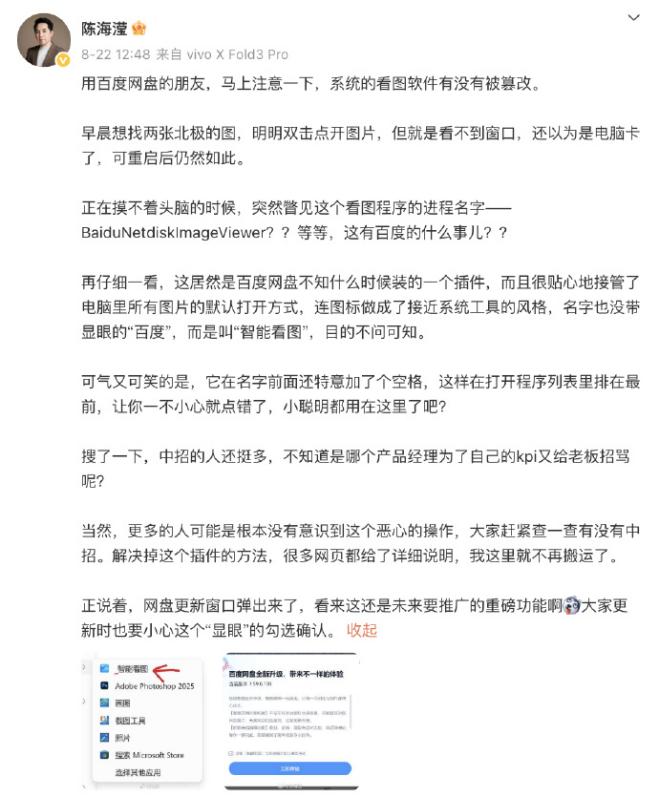 在竞争之外,基于隐私安全的信任危机则进一步为百度网盘的发展注入了变数。今年8月,知名摄影师陈海滢在社交媒体上发布了一条引发广泛关注的博文,揭露了百度网盘“智能看图”插件的存在。