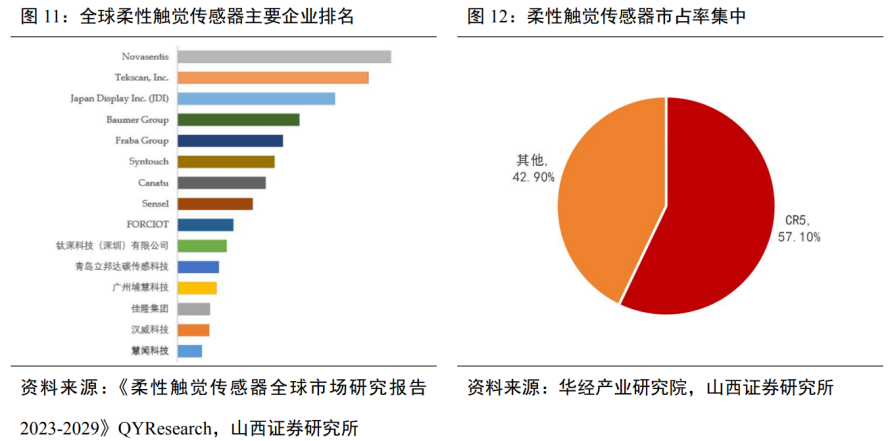 此外,就是机器人赛道中老生常谈的国产化替代问题。电子皮肤这块依然是欧美日企业主导,山西证券报告显示,全球柔性触觉传感器市场排名TOP5的厂商Novasentis、Tekscan、JDI、Baumer、Fraba均为海外企业,合计占有大约57.1%的市场份额。