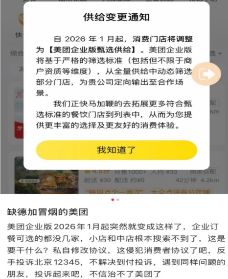 据美团企业版发布的通知,自2026年1月起,消费门店将调整为“美团企业版甄选供给”,美团企业版将基于严格的筛选标准(包括但不限于商户资质等维度),从全量供给中动态筛选部分门店,为合作企业定向输出至消费场景,并表示正加快拓展更多符合标准的餐饮门店,以提供更丰富的选择及更友好的消费体验。