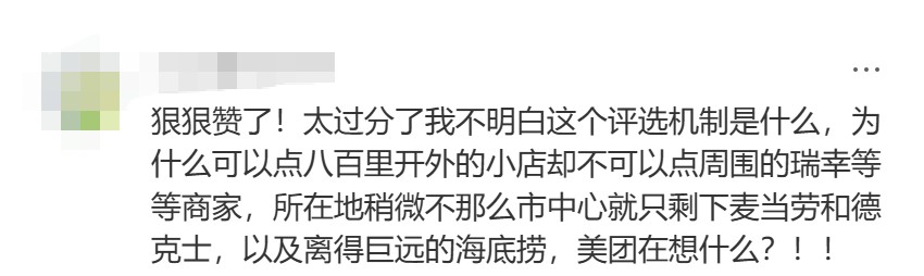 相关帖子的评论区更是炸了锅,地域适配混乱也成为另一大槽点。有用户不明白“这个评选机制是什么,为什么可以点八百里开外的小店?却不可以点周围的瑞幸等商家,所在地稍微不那么市中心就只剩下麦当劳和德克士,以及离得巨远的海底捞”。