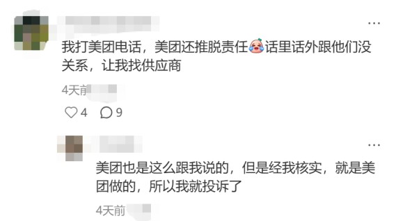 客服响应滞后与责任推诿进一步加剧了用户不满。“有用户致电美团客服反馈问题时,对方还推脱责任,话里话外跟他们没关系,让其找供应商”;有用户在评论区追评,“美团也是这么跟我说的,但是经我核实,就是美团做的,已经投诉了”。