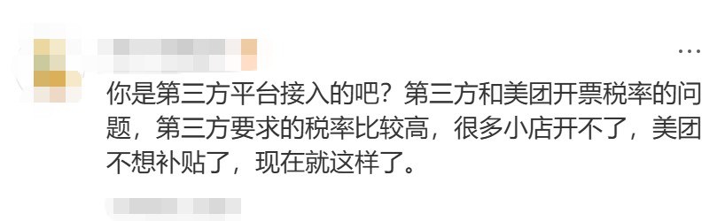 关于商户缩减的原因,网友也给出了多种猜测,其中“开票税率问题”的说法流传较广。有网友认为出现此次调整的原因系第三方和美团开票税率的问题,“第三方要求的税率比较高,很多小店开不了,美团不想补贴了”。
