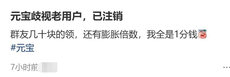 同时,元宝老用户也纷纷表达了不满。有自称是元宝老用户的网友认为自己受到歧视,已经注销元宝App,并表示“群友10元的领,还有膨胀倍数,我全是1分钱”“任务做完,抽的全是祝福语,红包最多1分钱,已注册440多天,对老用户‘友好’”。