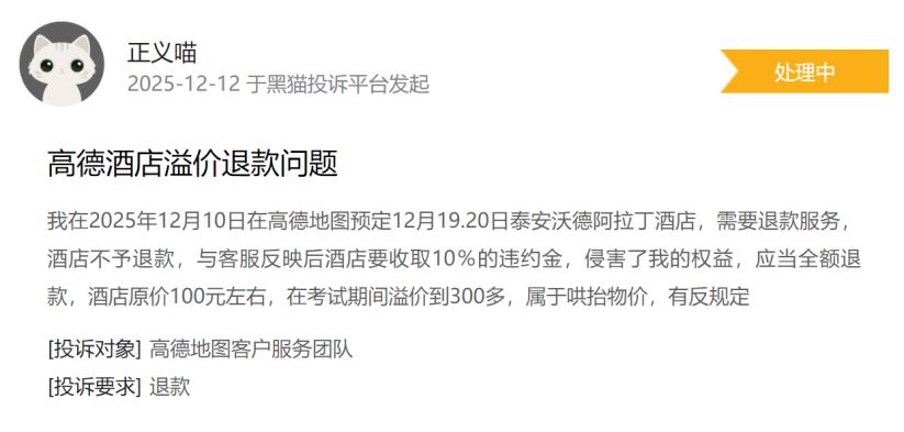 值得一提的是,另有网友投诉称,其于2025年12月10日在高德地图预订12月19日至20日泰安沃德阿拉丁酒店,后续需要退款服务时酒店却不退款。向客服反映后,酒店要收取10%的违约金,该网友认为自身权益受到侵害,应当全额退款,该酒店原价100元左右,在考试期间溢价到300多元。