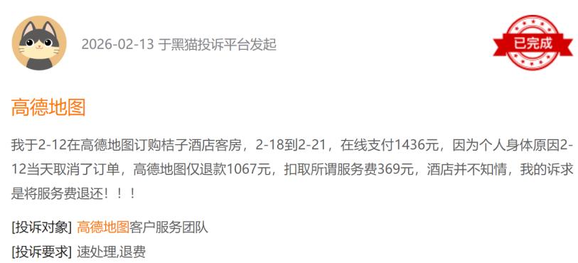 此类纠纷并非个例,另有网友投诉,于2026年2月12日在高德地图订购桔子酒店客房,时间为2月18日到2月21日,在线支付1436元,因其个人身体原因2月12日当天取消了订单,高德地图仅退款1067元,扣取所谓服务费369元,酒店并不知情。