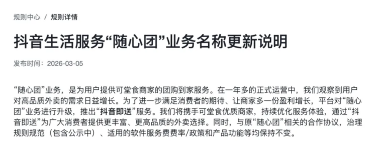 2026年3月,抖音生活服务正式宣布将旗下“随心团”业务更名为“抖音即送”,这一调整并非单纯的名称变更,而是抖音对到家服务的一次定位梳理与业务优化。