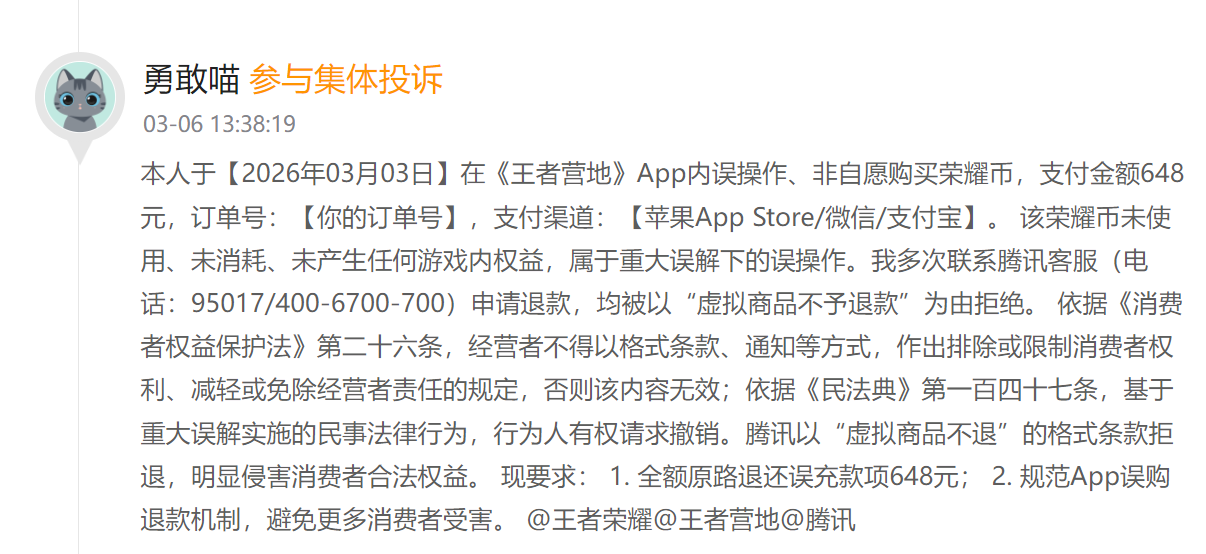 有用户3月3日于《王者营地》App进行充值时,误支付648元购买荣耀币,相关虚拟货币未使用、未产生游戏内权益消耗。该用户多次联系腾讯客服申请退款,均被平台以“虚拟商品不予退款”为由拒绝。