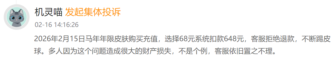 另有用户反馈,2026年2月春节活动期间,选择68元充值档位却被系统扣除648元,同样遭遇退款受阻、客服推诿情况,且此类情况并非个例。
