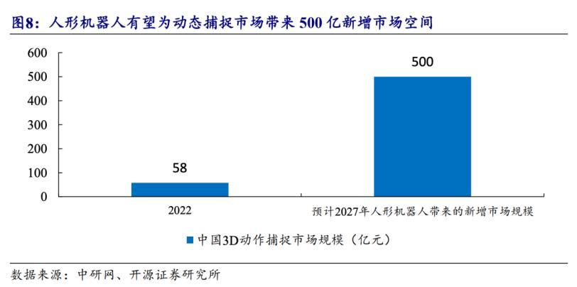 与人形机器人类似,目前的动作捕捉赛道在国内正处于大规模普及阶段,之前,动作捕捉的下游应用赛道主要集中在电影制作、游戏开发、医疗健康、教育培训等。中研网数据显示,2022年动态捕捉市场规模为58亿元。但由于人形机器人的数据采集需要,预计2027年带来的新增市场规模为500亿元。