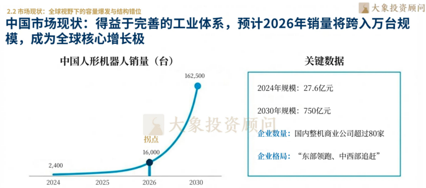 大象研究院2026年2月发布的《人形机器人行业研究报告》显示,得益于完善的工业体系,预计中国市场2026年销量将跨入万台规模,成为全球核心增长极。