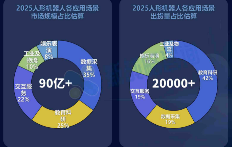新战略移动机器人产业研究所和人形机器人场景应用联盟发布的《2025-2026年人形机器人产业发展研究报告》显示,2025年人形机器人各应用场景市场规模占比分别为:数据采集35%,教育科研25%,交互服务22%,工业及物流10%,娱乐表演8%。如果按出货量占比估算,教育科研用人形机器人占比超过四成达42%,即数据采集为19%,交互服务19%,娱乐表演占16%,工业及物流占4%。