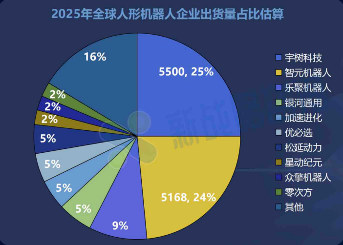 《2025-2026年人形机器人产业发展研究报告》显示,按2025年全球人形机器人企业出货量占比估算,宇树科技以5500台出货量占比25%位居榜首,智元机器人则已经出货5168台产品,占比24%,两家企业组成的第一梯队断崖式领先。